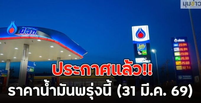 ราคาน้ำมันพรุ่งนี้ (31 มี.ค. 69) บางจาก ปตท. อัปเดตราคาล่าสุด กลุ่มน้ำมันเบนซิน เบนซิน ลิตรละ 49.64 บาท ซุปเปอร์เพาเวอร์ แก๊สโซฮอล์ 95 ลิตรละ 52.04 บาท (โออาร์) แก๊สโซฮอล์ 97 ลิตรละ 57.54 บาท (บางจาก) แก๊สโซฮอล์ 95 ลิตรละ 41.05 บาท แก๊สโซฮอล์ 91 ลิตรละ 40.68 บาท แก๊สโซฮอล์ E20 ลิตรละ 36.05 บาท แก๊สโซฮอล์...
