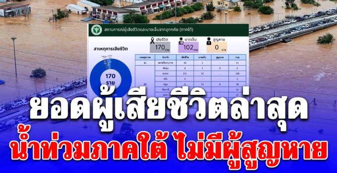 เมื่อวันที่ 30 พ.ย. 2568 กระทรวงสาธารณสุข (สธ.) รายงานสถานการณ์ผู้เสียชีวิต และบาดเจ็บจากอุทกภัย ภาคใต้ จากข้อมูล ระหว่างวันที่ 20-30 พ.ย.2568 ณ เวลา 08.00 น.(ข้อมูลจาก GIS และสำนักงานสาธารณสุขจังหวัด) มีจำนวนผู้เสียชีวิต 170 ราย โดยมีสาเหตุมาจากจมน้ำ 160 ราย, ไฟฟ้าช็อต 5 ราย, ถูกน้ำพัด 2 ราย และเหตุอื่น ๆ อีก 3 ราย สำหรับจังหวัดที่มีผู้เสียชีวิตสูงสุด คือสงขลา อยู่ที่ 131 ราย...