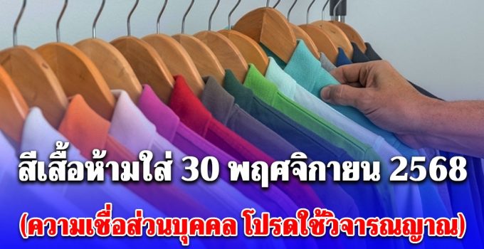 อัปเดตล่าสุดกับ สีมงคลประจำเดือนพฤศจิกายน 2568 สีมงคลประจำวัน ถือเป็นเคล็ดลับยอดนิยมที่ช่วยเพิ่มพลังบวกในชีวิต ไม่ว่าจะใช้ในการแต่งกายหรือเลือกใช้สิ่งของรอบตัว นอกจากนี้ยังมีคำแนะนำเกี่ยวกับ สีที่ควรหลีกเลี่ยง เพื่อช่วยเสริมดวงเด่นในแต่ละวันด้วย โดยในวันนี้ วันที่ 30 พฤศจิกายน 2568 สีใดบ้างที่จะช่วยเสริมดวงชะตาให้โดดเด่นมาดูกัน สำหรับเดือนพฤศจิกายน 2568 สามารถเลือกใส่สีเสื้อมงคลโทนสีสุภาพ แล้วคลุมทับด้วยเสื้อแขนยาว แจ็กเก็ต เบลสเซอร์ สีโทนเข้มเพื่อให้สอดคล้องกับการถวายอาลัยพระพันปีหลวง สีมงคลวันอาทิตย์ที่ 30 พฤศจิกายน 2568 เสริมการงาน – สีเบจ, สีเทา เสริมการเงิน – สีม่วง เสริมโชคลาภ – สีเขียว เสริมเสน่ห์ – สีแดง เสริมอำนาจบารมี –...