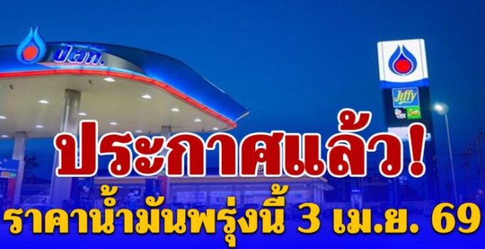ประกาศแล้ว! ราคาน้ำมันพรุ่งนี้ 3 เมษายน 2569 สำนักงานนโยบายและแผนพลังงาน (สนพ.) กระทรวงพลังงาน การรายงานสถานการณ์ ราคาน้ำมันพรุ่งนี้ สถานีบริการน้ำมัน ได้แก่ อัปเดตล่าสุด 5 สถานีบริการน้ำมัน ปั๊ม ปตท. แก๊สโซฮอล์ 95 : ราคา 43.25 บาท/ลิตร แก๊สโซฮอล์ E20 : ราคา 38.25 บาท/ลิตร แก๊สโซฮอล์ E85 : ราคา 34.99 บาท/ลิตร แก๊สโซฮอล์ 91 : ราคา 42.88 บาท/ลิตร แก๊สโซฮอล์...